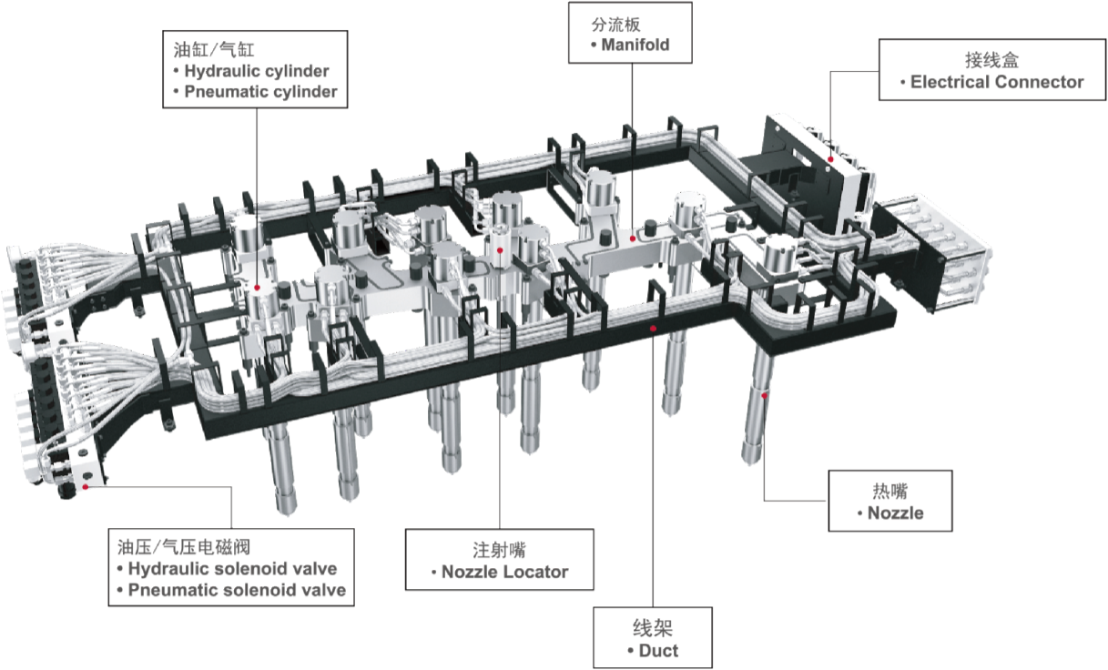 热嘴与分流板采样螺纹连接,可避免漏胶,缸体单独冷却,寿命有保证,气路、油路冷却采样管道连接,模具设计加工简单。